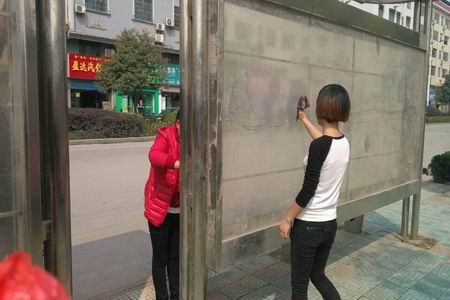 活动进行期间,班级负责人先给志愿者分配了任务,并且亲自做了示范。活动正直下午,阳光强烈,大部分同学是第一次参与此类活动,对此略显生疏。由于沿街店铺人流众多且小广告大都都粘贴在不为人所注意的地方,或在墙角,或贴在高高的站台上,这给志愿者们带来不少了困难。在活动中志愿者们都站在椅子上或者蹲在站台专心地清理着这些城市牛皮癣。经过了近三个小时的清理工作,沿街的大多数小广告都被清理干净。