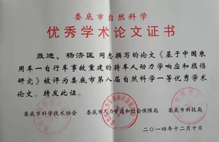 会上宣布我院科协荣获2014年市直学会工作先进集体;我院青年教师、汽车学院聂进博士的《基于中国乘用车――自行车事故重建的骑车人动力学响应和损伤研究》论文获娄底市第八届自然科学一等奖。(罗正斌)