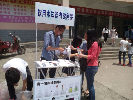 活动在学校一食堂右侧举行,时间选在同学们下课以后。此次活动主要以知识问卷为主,围绕我们平常饮用过的矿泉水展开调查。根据问卷答题情况来看,大多数学生还是知道我们日常饮用的矿泉水属于哪一类水,但是就饮用水是否含有对人体有益稀有的矿物元素这个问题一直感到疑惑。通过查询与测试他们获得了相关知识,问题得到圆满的解答。(周舟)