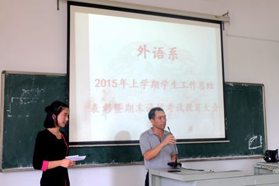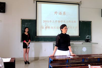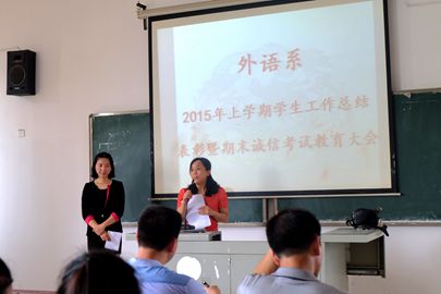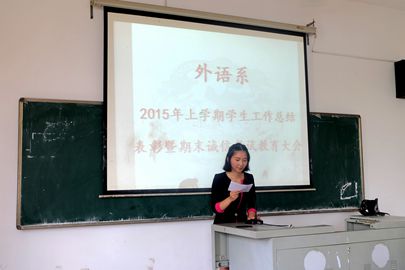6月15日中午,外语系在主教楼318召开2015年上半期学生工作总结表彰暨期末诚信考试教育大会,参加大会的有系主任刘燕、教学主任肖付良、学工主任贺建良、辅导员周春红、张扬老师以及外语系全体学生。会议由学生刘昕主持。 贺建良回顾总结了2015年上半期学生工作所取得的成绩和完成的各项任务,主要表现为:1、英语口语比赛, 2、英语作文演讲比赛, 3、“我是大学生”演讲比赛 , 4、“公益活动、人人参与”演讲比赛 , 5、女子排球比赛, 6、新闻创作大赛 , 7、暑期“下乡”活动。主持人宣读各项学生活动中获得的班级和个人名单,系领导和辅导员分别为获奖班级和个人颁奖。 肖付良宣读了学院关于考试的有关规章制度,对全体学生进行诚信考试教育。她要求同学们端正考试态度,认真搞好复习,严禁在考试中出现舞弊行为。 最后刘主任讲话,她指出:同学们在各项活动中取得好的成绩,同时她也指出三点要求:1、按时上课,积极参加活动,2、认真复习,争取不挂科,3、安全回家,平安返校,并提前祝大家端午节快乐。(唐玲秀) ![]() 主持人 ![]() 总结 ![]() 诚信教育 ![]() 表彰(一) ![]() 表彰(二) ![]() 大会现场 ![]() 刘主任最后总结 | |