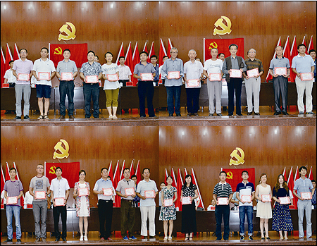 会议在嘹亮的国歌合唱中开始。党委委员、党校校长梁凌洁宣读了新党员发展名单,学工处处长欧芳带领109名新党员面向党旗庄严宣誓。龙伟宣读表彰优秀党员的决定,与会领导为获得娄底职院2015年度优秀共产党员称号的27名同志颁发了获奖证书。