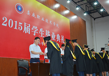 副院长、工会主席颜彩飞宣读省级、院级优秀毕业生表彰决定。院领导们为获奖者代表颁发荣誉证书。雷立成院长为优秀毕业生代表一一颁发毕业证书。黄洋同学致毕业感恩词。