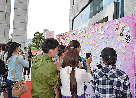 今年的毕业典礼特设了走红毯签名及留影区。毕业留言墙上密密麻麻贴满了记录难舍母校与师友心情的心形留言卡。粉白紫三色为主色调的合影背景墙描绘出了同学们仰望星空与展翅高飞的心愿,毕业生们在此与院领导们合影,留下了难忘的人生印记。