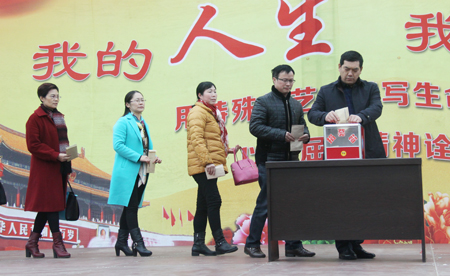 演出中,娄底职院学生代表上台接受了“心灵之声”艺术团赠送的书法作品――娄底职院院训“学以致用 自强不息”,院领导及各系部处室代表还纷纷捐款献爱心,代表全院师生对参加表演的残疾演员表示了真挚的感谢和敬意。(宣传部)
