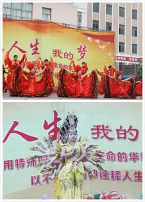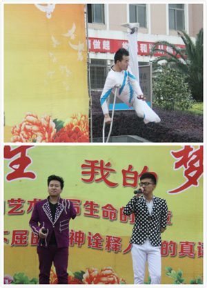 11月26日,以“我的人生 我的梦”为主题的一场特殊的文艺演出在我院文化广场举行。来自北京“心灵之声”残疾人艺术团的演员们,用他们残缺的身躯演绎了一个个精彩绝伦的节目,以不屈的精神谱写了生命的华章。他们身残志不残的精神,让在场的师生接受了一次精神洗礼。副院长周志和、各系部处室负责人、各系学工主任以及学院全体学生观看此次演出。
