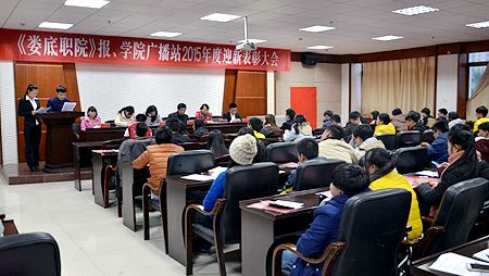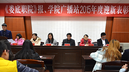 12月18日下午,《娄底职院》报、学院广播站2015年度迎新表彰大会在综合楼一楼会议室举行。宣传统战部部长王宗凡,宣传统战部老师刘艳、李莉、欧阳琦及院报记者站站长吴萍、广播站站长刘煌出席,院报、广播站全体成员参加。大会还邀请了院学生会主席团、院团委、社联主席团、院学生会宣传部代表参加。