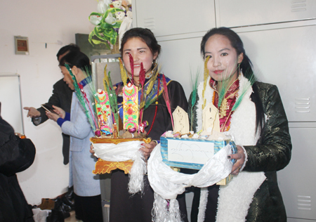 为了迎接新年的到来,藏族学生用藏饰门帘、围布、哈达,用墙漆手绘将寝室装饰一新,并摆上了从家中带来或本地采购的风干牦牛肉、酥油茶、奶渣、糌粑、青稞、麻花、水果、糖果、糕点等美食。领导们来到寝室,藏族学生们送上了插着唐卡、装满糌粑、青稞和米面的切玛(五谷斗),捧上了青稞酒、啤酒、酥油茶,敬献上哈达。领导们按照藏人习俗,用右手捏米面或蘸酒,向天空弹三下(意为敬天、敬地、敬祖先),然后“三口一杯”大碗喝酒。“藏族同学们,罗桑尔让(新年好)!扎西德勒(吉祥如意)!”欢声笑语响彻在寝室内外。在校园四周,庆祝藏历新年的条幅也随处可见,欢度节日的学生们围坐一团,做游戏、唱歌,领导们来到他们中间,一边聆听这动听的藏语歌曲,一边询问着学生的生活学习,祝愿他们在娄职过一个吉祥愉快的新年,学成后早日报效自己的家乡。