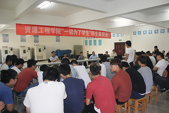 资源工程学院是我校很有特色的二级学院,开设工程测量技术、煤矿开采技术、矿山机电技术等专业。其中煤矿开采技术专业被确定为省级精品专业、省级特色专业、中央财政重点支持建设的“煤矿安全实训基地”、资源开发与测绘大类专业骨干教师国家级培训基地、湖南省技术练兵基地、湖南省中小企业职工培训示范基地和湖南省特种作业人员培训基地。为全面了解学生的思想、学习、生活状况,建立卓有成效的工作运行机制,营造良好的育人生活环境,该学院在全体师生中举办“一切为了学生”座谈会,资源工程学院院长祖国建、副院长李飞轮、王税睿与该院全体师生共同参加。大家围绕该院教学管理、学生管理、后勤工作、教风学风、硬件设施建设等方面畅所欲言,学生积极提问,老师耐心回答,现场气氛和谐。