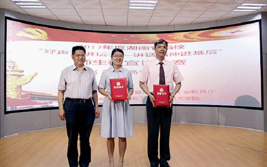 527,由中共湖南省委教育工委宣传部主办、湖南工业职业技术学院承办的2017年度湖南省高校“好声音讲坛——讲话精神进基层”师生微宣讲比赛高职高专组决赛在湖南工业职院举行。省委宣传部理论处处长殷晓元、省委宣传部理论处主任科员肖斌、湖南农业大学马克思主义学院院长刘新春、湖南商学院党委宣传部部长陈明、长沙理工大学党委宣传部副部长邱国良等专家担任大赛评委。