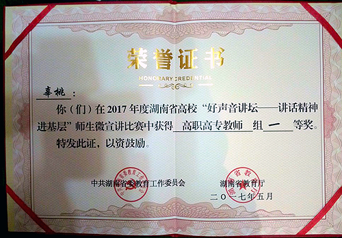 经过激烈角逐,我院辜桃老师、湖南工业职业学院徐雷老师获得教师组一等奖,学生组一等奖被东道主湖南工业职业技术学院的文思求、毕超、谭小珍、肖雨、易博团队获得。一等奖选手也获得了2017 年度“好声音讲坛——讲话精神进基层”百姓微宣讲系列活动全省总决赛的资格。