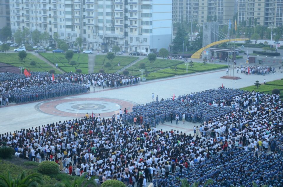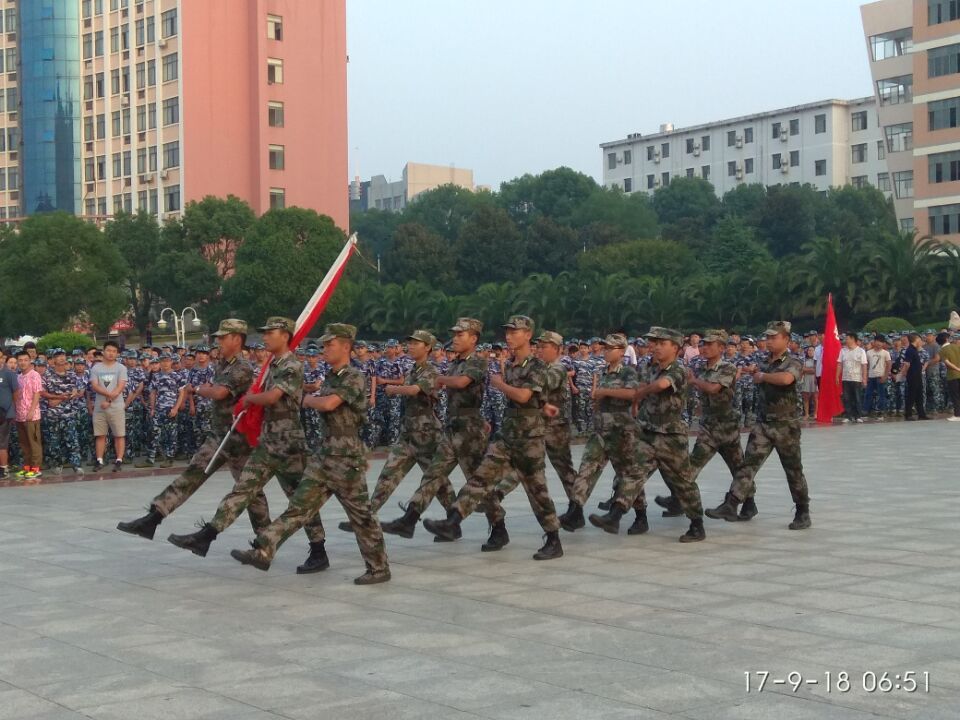 六点五十分,升旗仪式正式开始,刘媛在致辞中向顺利返校的学生们表示祝贺,向17级新同学们的到来表示欢迎,希望全体同学不忘国耻,努力学习,回报祖国与母校。在初升朝阳照耀下,一群身着军装,气宇轩昂的国旗班成员迈着铿锵的步伐来到了国旗台下,全场一片肃静。升旗手振臂一挥,鲜艳的五星红旗徐徐展开,在全校师生的注目中,在庄严的国歌声中,五星红旗冉冉升起。