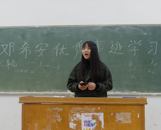 首先,主持人指出了班会的主旨——挖掘我们身边的优秀典型,学习他们的优秀事迹 ,接着介绍了邓希安平生事迹,今年66岁的她,把孤寡五保老人当父母,把计育龄妇女当亲人,把村里村外事当自己事。班会要求大家通过榜样的示范作用与力量,激励我们明确方向,奋发进取,树立正确的学习观。