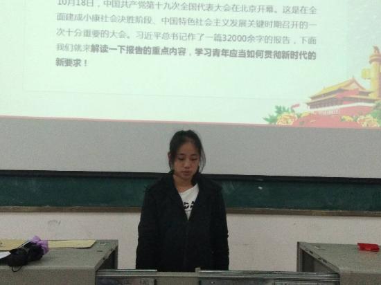 班会伊始,辅导员们围绕十九大及报告概括,十九大报告重点解读,新提法、新概念解读,贯彻新时代的新要求四个方面讲述十九大报告。党的十九大是在全面建成小康社会决胜阶段召开的一次十分重要的代表大会,是党和国家政治生活中的一件大事。班会重点讲了大会的主题和习近平总书记的重要讲话。随后学生代表上台发言。(经济管理学院)