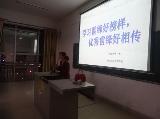 为积极响应校团委的号召, 大力弘扬和践行“奉献、友爱、互助、进步”的志愿服务精神。 3月11日晚,电子信息工程学院以班为单位分别在主教楼5楼各个多媒体教室开展以 “学习雷锋好榜样,优良传统永相传”为主题的团组织生活。活动在全体辅导员的组织以及各班班干部的积极配合下有序进行。