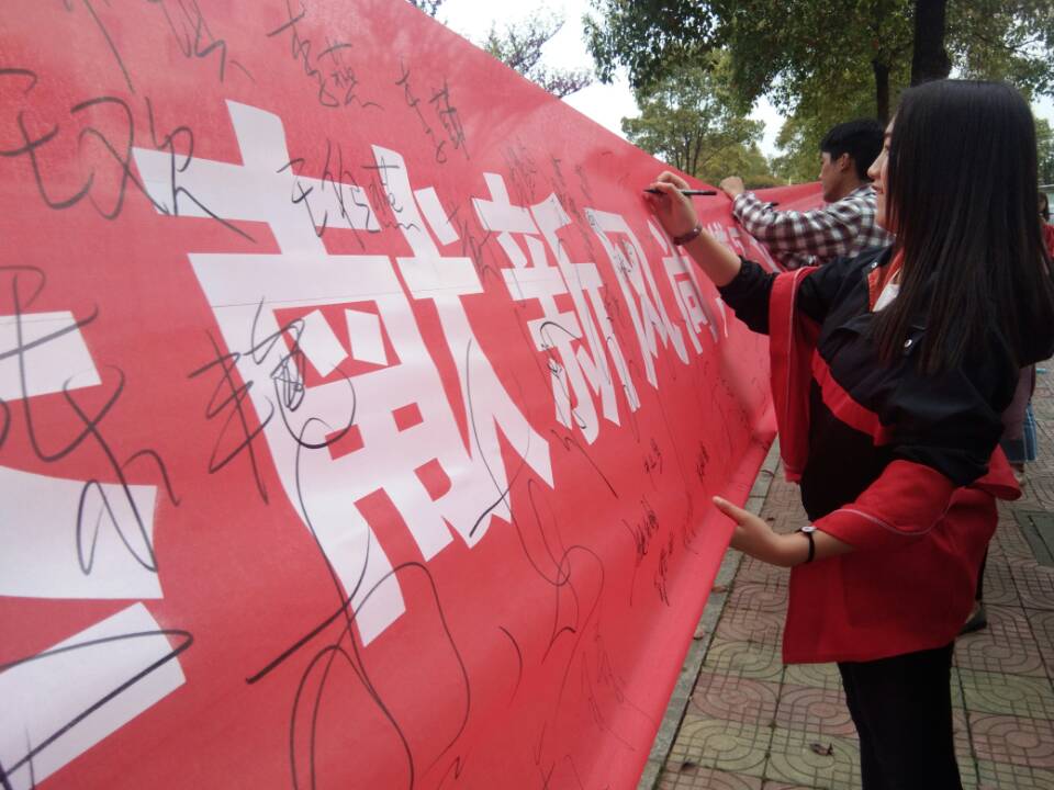 29日中午,17级旅管一班、酒管班、市营二班组织开展以“创建和谐校园”为主题的拉横幅签字活动。同学们个个都争先恐后,激情昂扬,拉上自己的同学朋友来签字,一条长长的横幅很快就被三个班的同学顺利填满了。随后,各班班长发言说明了环保的重要性,共同交换三月学雷锋当志愿者的心得与环保经验。拉横幅签字活动就在欢乐中圆满结束。(经济管理学院)