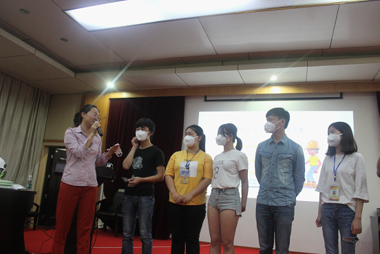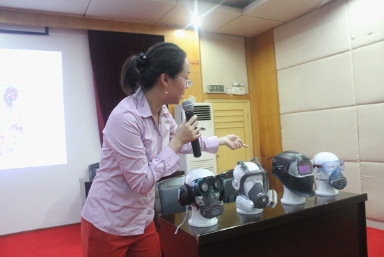 李秀娟对健康安全防护用品的使用和防护职业病知识进行讲解。她边讲边教同学们如何正确佩戴好各种防护用具保护自己的身体,将生产安全防护知识生动形象地传递到每一位同学的心中。