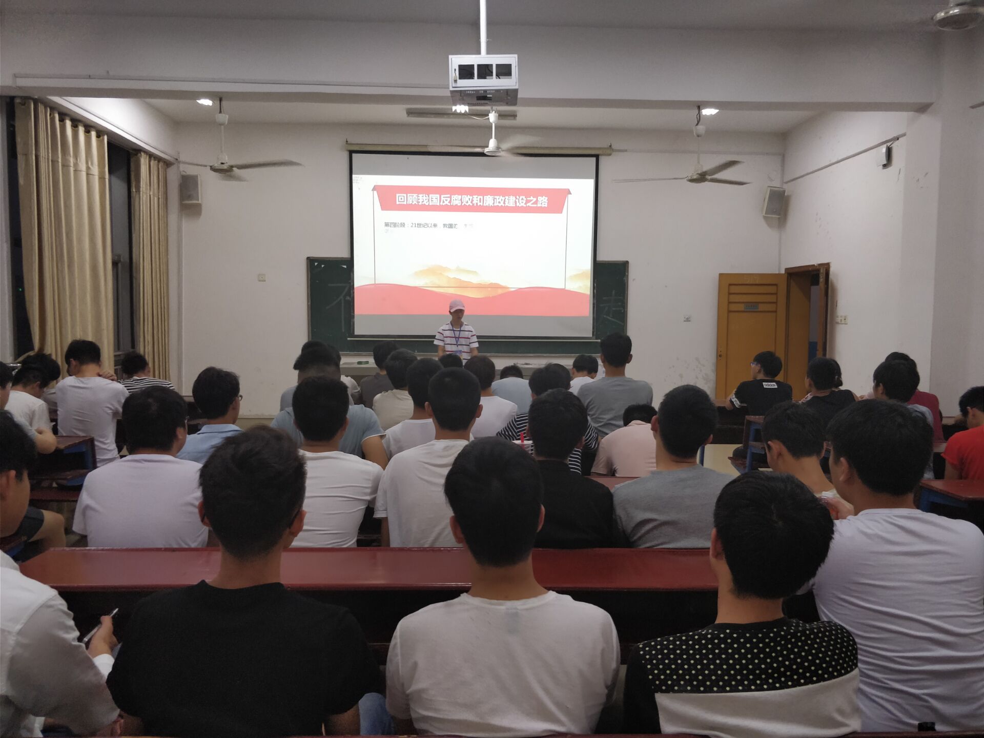 活动伊始,全体起立歌唱团歌,随后,由班团支书担任主持人,通过PPT、小视频的形式进行,让同学们深入了解十九大精神。通过党的优秀干部事迹、90后优秀青年的事迹、学习五四青年节重要讲话精神等,让同学们了解“不忘初心跟党走”的实际内容和意义,告诉大家应该怎样选择今后的人生道路,怎样树立自己的人生目标。活动过程中,同学们认真观看PPT,聆听主持人讲解,在互动环节,同学们认真积极地回答主持人所提出的问题。