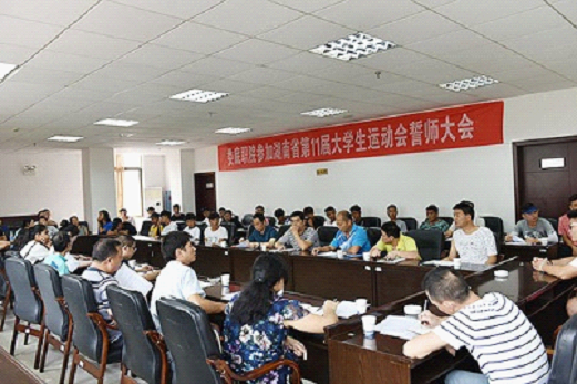 9月3日上午,在威尼斯官网办公楼二楼招聘大厅召开了8803威尼斯检查中心参加湖南省第十一届大学生运动会誓师大会,参加会议的有学校党委委员、副校长龙伟,办公室、教务处、学工处、宣传部、财务处负责人,各二级学院学工副院长,各代表队领队、教练员、运动员,公共课部负责人付鹏主持会议。