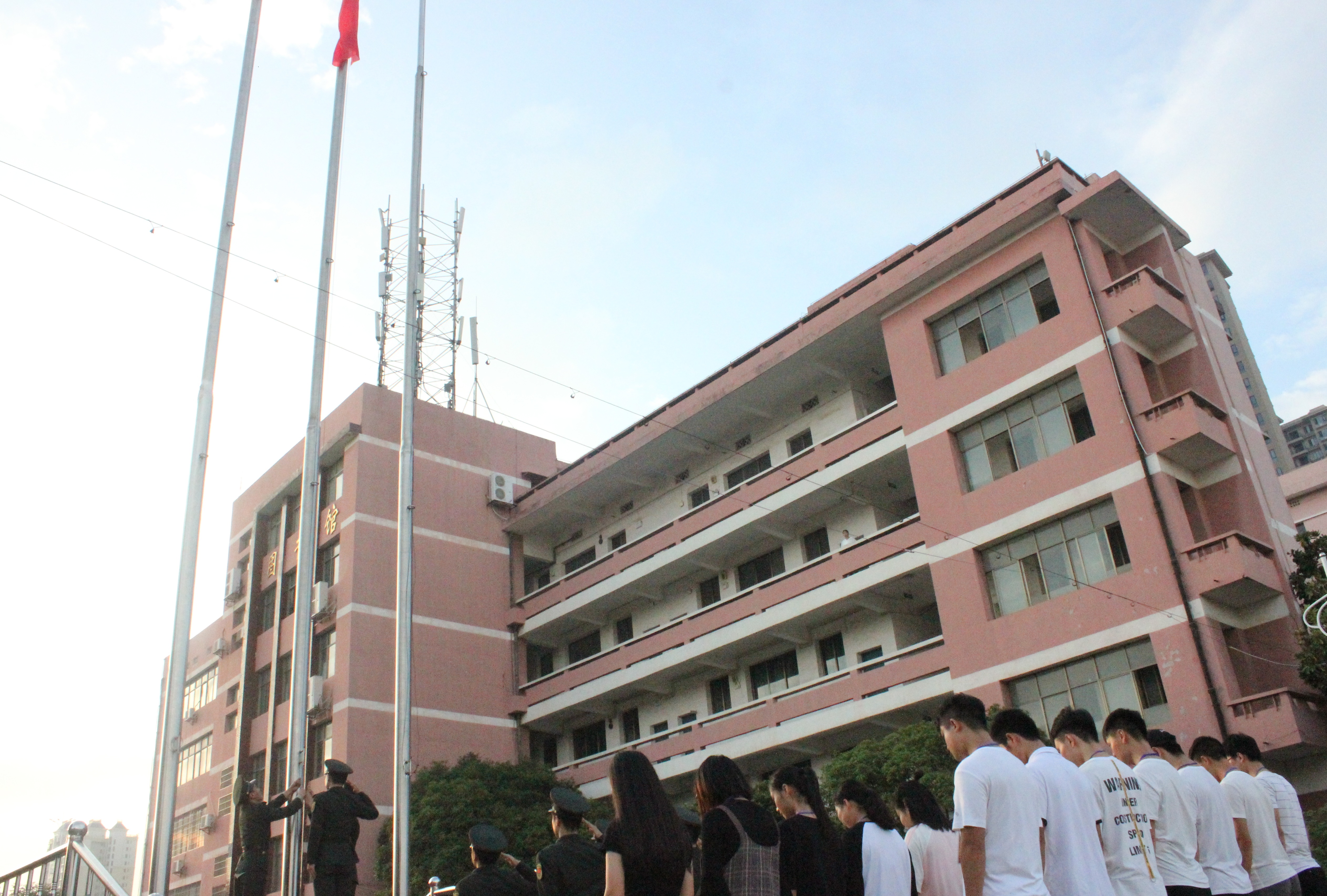 在“勿忘国耻,振兴中华”嘹亮的口号中,国旗班护卫国旗入场,伴随着雄壮的《义勇军进行曲》,鲜艳的五星红旗在旗手的护卫下冉冉升起,参加仪式的全体师生肃穆而立,向国旗庄严地行注目礼并唱响国歌。
