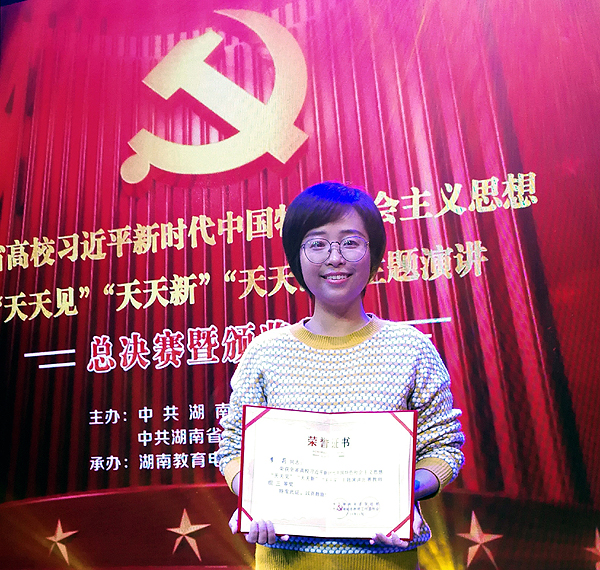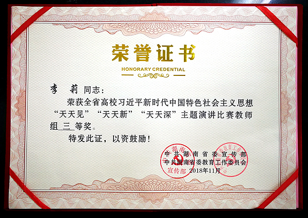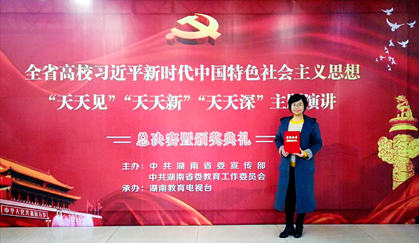 11月23日,由中共湖南省委宣传部、中共湖南省委教育工作委员会主办,湖南教育电视台承办的“湖南省高校习近平新时代中国特色社会主义思想‘天天见 天天新 天天深’主题演讲比赛”总决赛暨颁奖典礼在长沙举行,全省各高校共43位师生成功入围总决赛角逐,威尼斯官网教师李莉荣获三等奖。