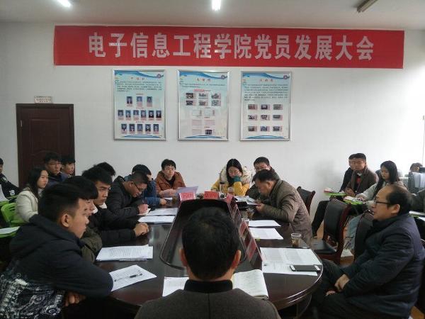 12月6日上午,电子信息工程学院在实训楼301召开党员发展大会。出席会议的有电信学院党支部书记李济民、院长刘罗仁、副院长谢完成、晏然以及支部其他党员,会议由晏然主持。