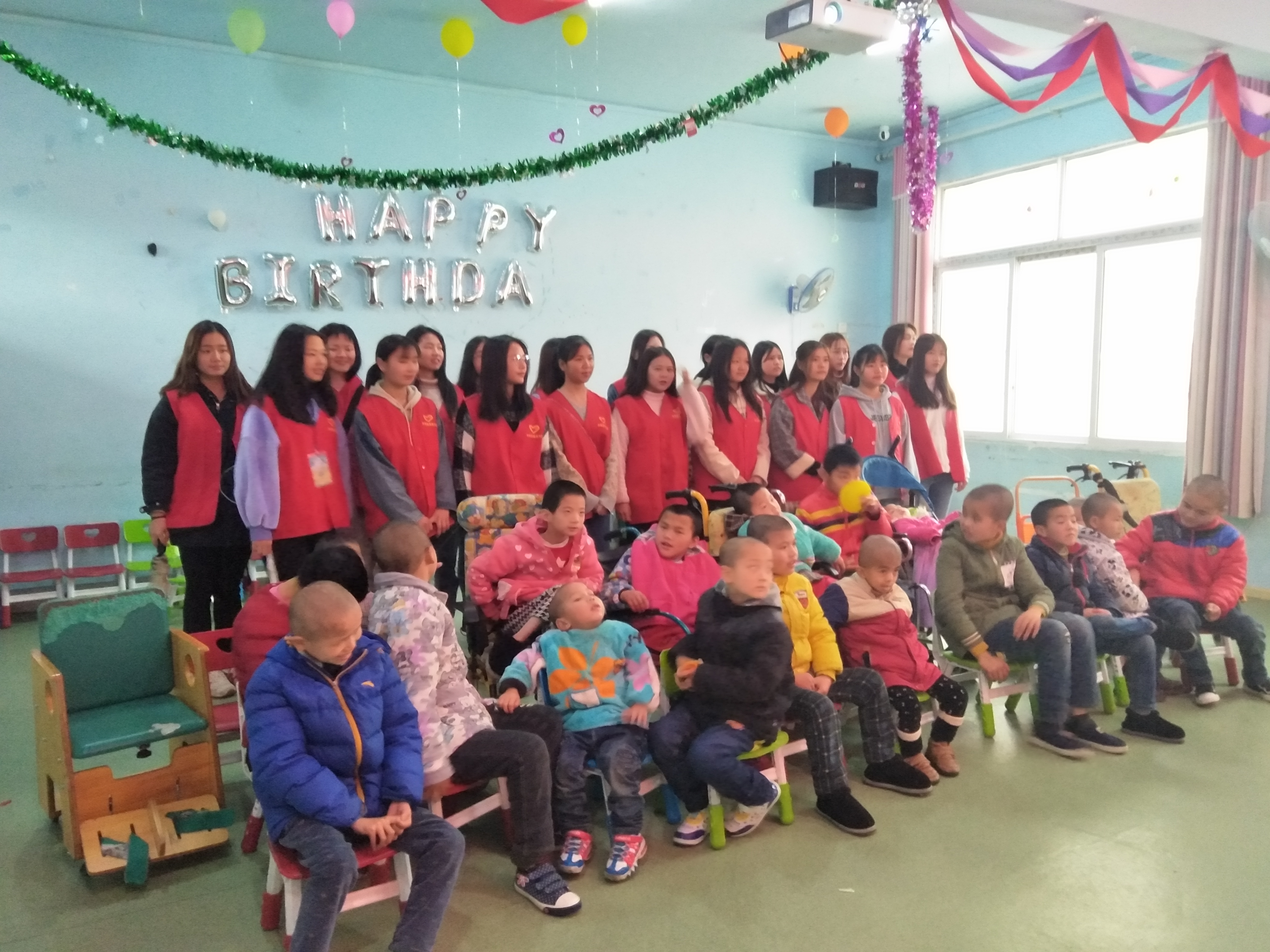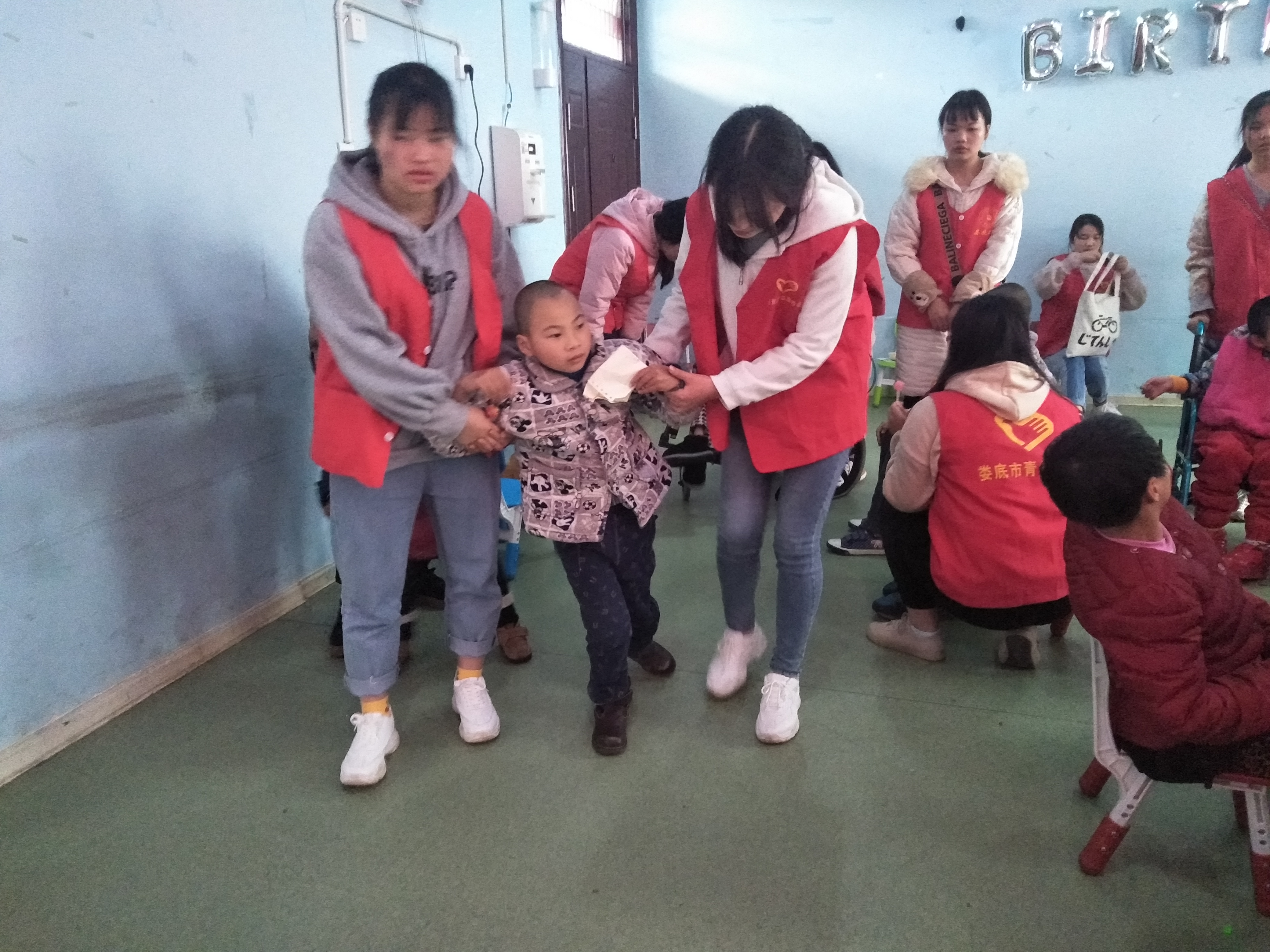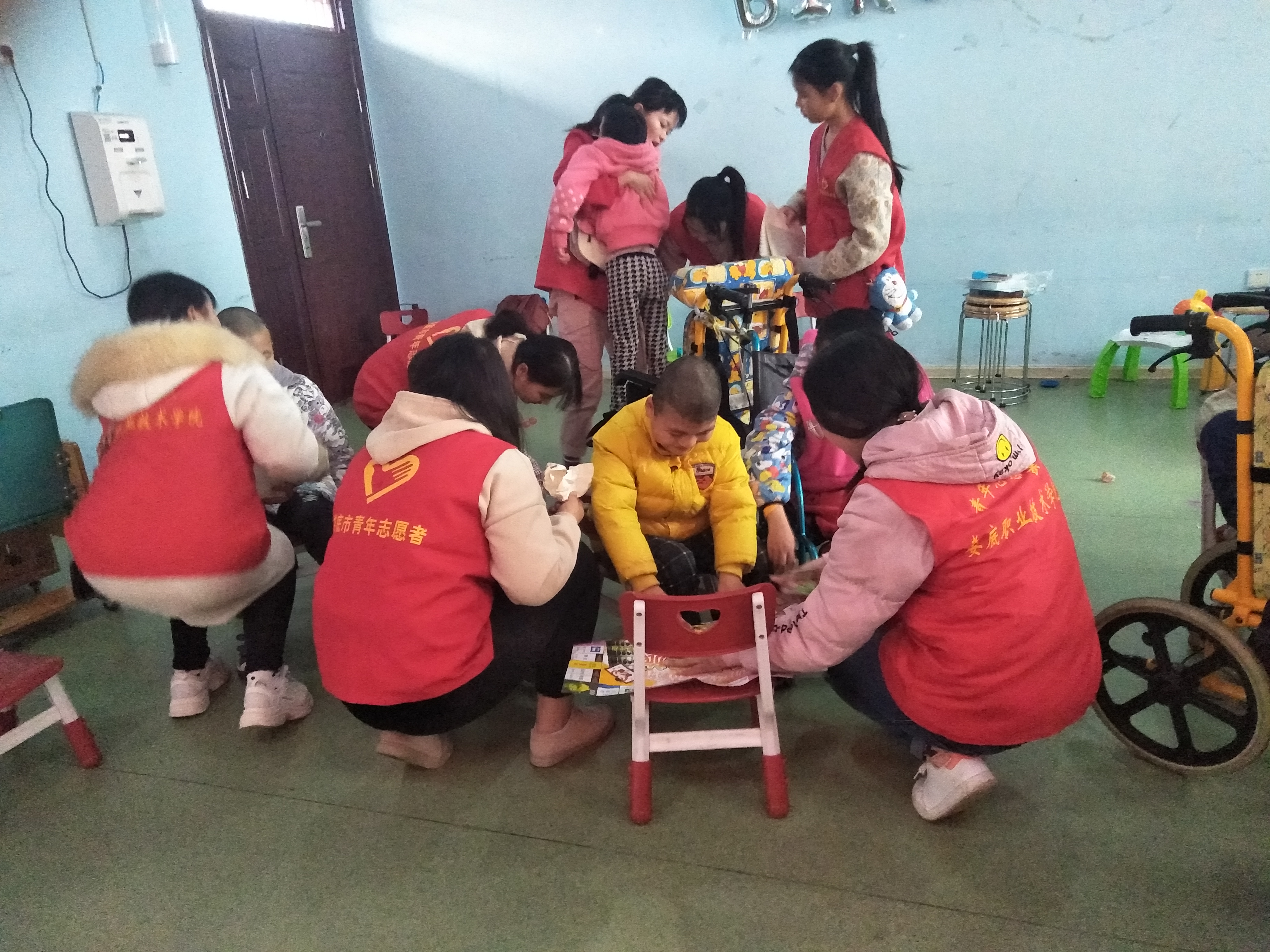 活动伊始,18旅管班学生代表在新培楼前坪集合,团总支书记廖芳老师告诉同学们要对孩子们有耐心以及一些注意事项。到达目的地,经福利院护理员们同意后,同学们开始带孩子们玩耍,把带来的玩具分给孩子们玩,教他们画画,唱歌,玩游戏,折纸玩具,细心的搀扶残疾儿童行走,耐心的与脑瘫儿童交谈,教室里充满了欢声笑语。