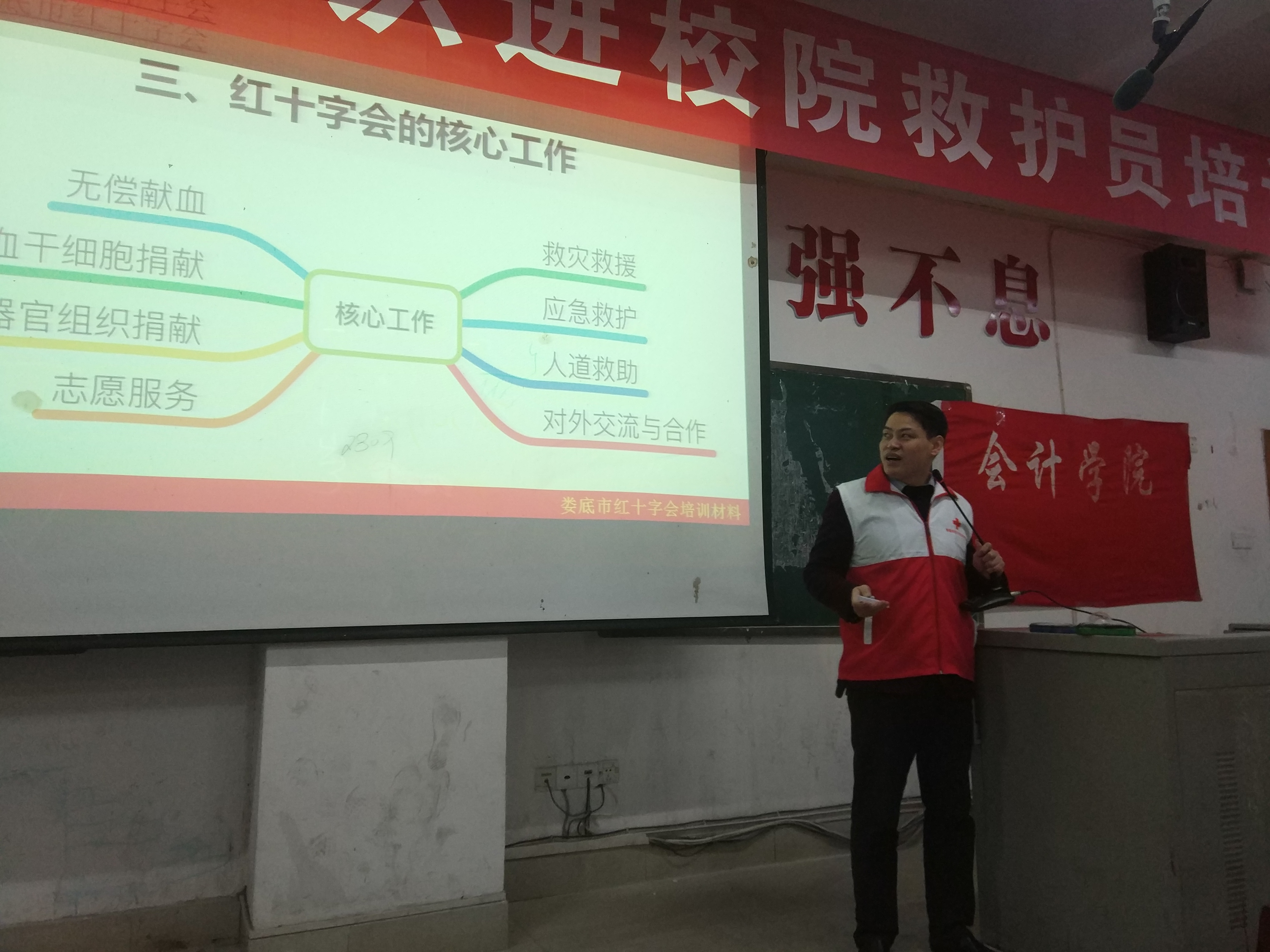 为普及应急救护知识,增强师生紧急避险和自救互救的能力,保障师生的生命安全和身体健康。3月23日―24日,会计学院特邀“娄底市红十字会”专业讲师,在主教楼110联合举办“急救知识进校园”活动,开展救护员培训。会计学院学工副院长禹云、团总支书记胡婷及各班志愿者300人共同参与本次培训活动。