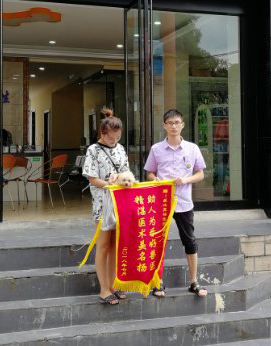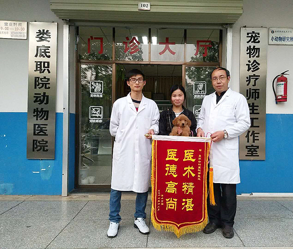 收到锦旗(左为胥世久,右为娄底职院动物医院院长龚泽修)