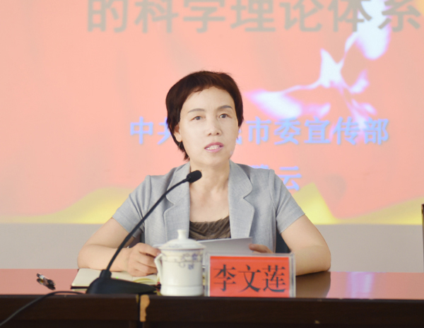 李文莲主持讲座。她评价李腾云的讲座把复杂的问题简单明了地说了出来,把深奥的道理用风趣幽默的话说出来,讲话接地气,入人心。李文莲表示,此次学习她有三点收获:一是再次深刻感受到了习近平总书记深厚的人民情怀,二是深切感受到了中国崛起的力量,三是深切感受到了自身的责任、压力。李文莲要求全体党员深刻反思教育者的责任,做好自己的本职工作,在民族复兴、国家强盛的过程中,为实现文化自信做出自己的贡献。