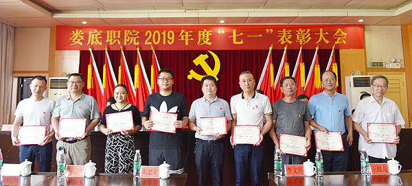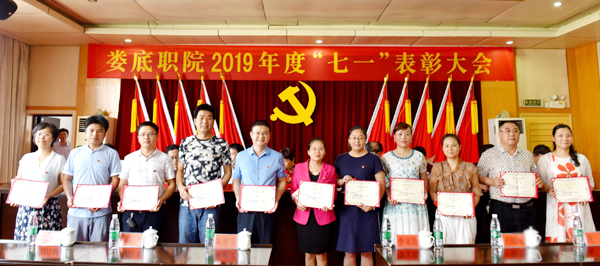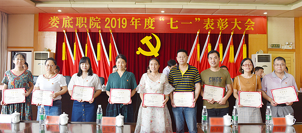 党委副书记王健龙同志宣读表彰决定:李莉等20人被授予校“优秀共产党员”称号,梁艳丰等10人被授予校“优秀党务工作者”称号;刘清平被学校授予“脱贫攻坚一线优秀共产党员”称号;禹华芳、李权、曹滢丹获得湖南省先锋工程标兵、示范岗荣誉称号。校领导为获奖者颁奖。