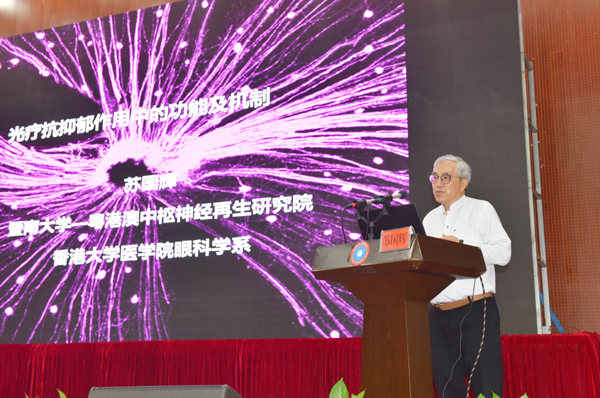 讲座中,苏国辉以图文并茂的PPT生动地阐释了他领导的科研小组的最新研究成果——用光疗抗抑郁。他介绍了精神疾病发展报告(1990-2016),光的非成像功能,视觉系统网络特征,形象地解释了光疗如何作用于视觉系统从而治疗抑郁。他在报告中列举多个动物实验数据,推导出光疗抗抑郁的神经环路机制。国际著名学术期刊、神经科学领域顶级期刊《Neuron》评价这一研究“用光来驯服抑郁这只‘黑狗’”,《Nature Reviews Neuroscience》则以“照亮抑郁”为题发表特别推介文章。