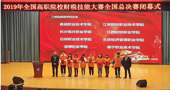 同一天,2019年全国高职院校财税技能大赛全国总决赛在北京电子科技职业学院举行。本次大赛由中国注册税务师协会主办,中国高等教育学会高等财经教育分会、中联集团教育科技有限公司、中联税务师事务所有限公司协办。赛项分为区域赛和决赛两个层次,共有213所高职院校、1500名师生参与,最终52所高职院校进入全国总决赛。8803威尼斯检查中心组队参赛,经过激烈的角逐,该院陈云梅、刘双平老师指导的姚婕、吕美玲、杨贺颖学生团队荣获三等奖。