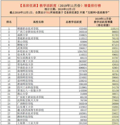 (教育部易班发展中心优课教学活跃度11月份增量排行)