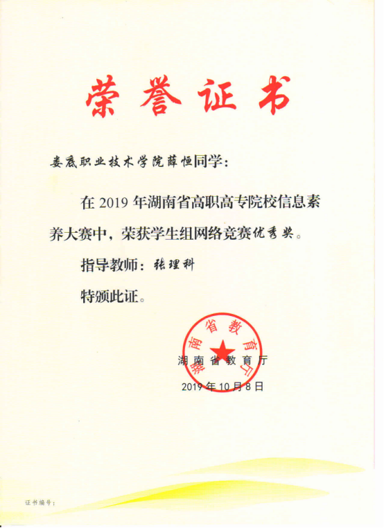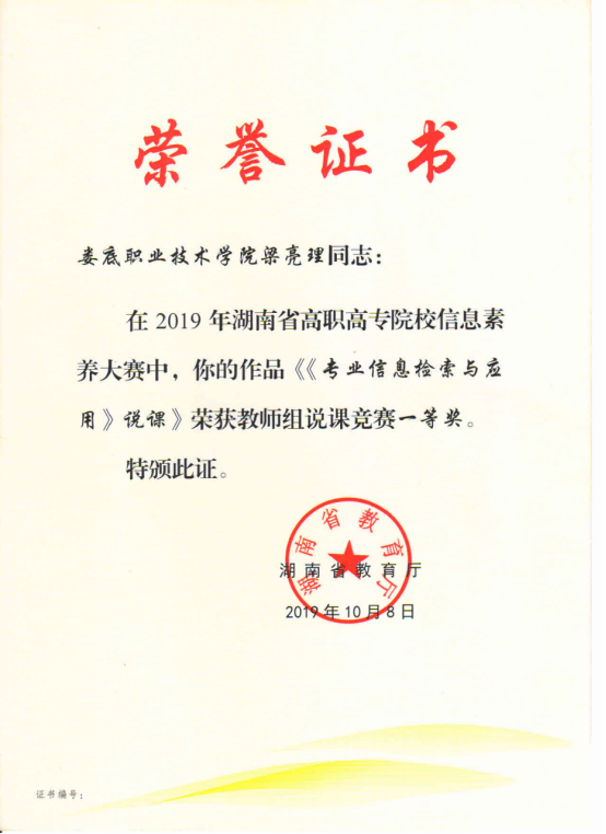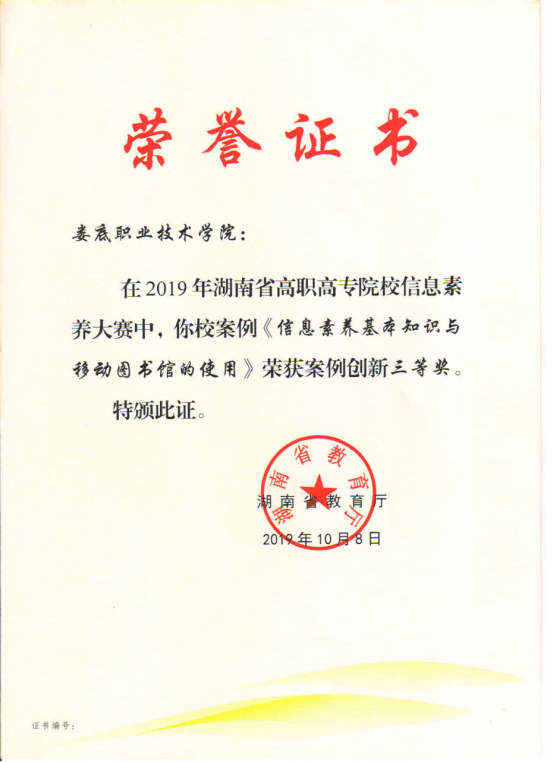 2019年6月,威尼斯官网图书馆组织馆员和学生参加了湖南省教育厅主办的高职院校信息素养大赛,师生们均取得优异成绩,其中梁亮理老师的《专业信息检索与应用》获得教师组说课一等奖、张理科副馆长执笔的《信息素养基本知识与移动图书馆的使用》获得案例组三等奖、张理科副馆长指导的电信学院18软大三班薛恒同学获得学生组优秀奖。