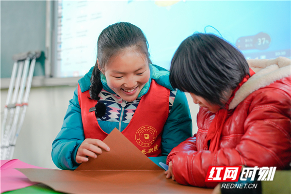 手工课上,韩力耐心地给孩子们讲解折纸步骤。