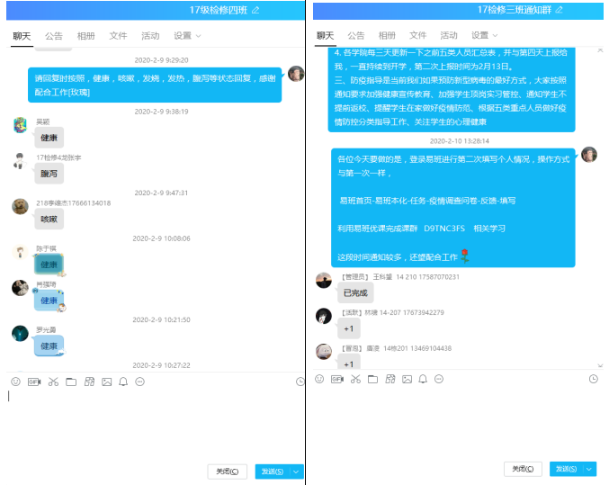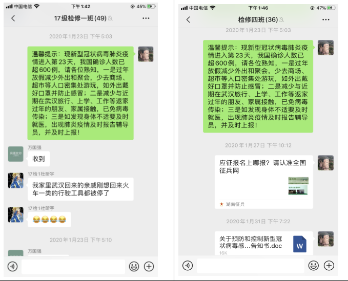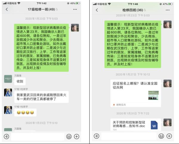 1月23号起,辅导员们迅速加入这场没有硝烟的战斗,从“假期模式”转入“战时状态”,“待在家里就是保健康,待在家里就是大担当”,通过微信、QQ等各类平台,辅导员们充分利用网络资源,第一时间发布第一轮通知: