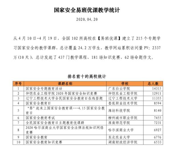 国家安全教育日线上学习中,运用易班优课创建上传《“4.15”全民国家安全教育日》《严格行业规范 维护社会安全防线》《全民国家教育日》《中华人民共和国反间谍法》4个视频学习课程,进行国家安全知识宣传。活动开展后,各学院广泛宣传,同学们积极参与并认真学习课群学习活跃度达1.7万,参与人数达近8600人。线上学习后,学生参加国家安全教育知识竞赛,根据各学院完成课程学习人数和考试成绩,最终,文化传播学院、护理学院、农林工程学院获得本次国家安全教育知识竞赛先进学院奖,谢玖成等十五名同学获得国家安全教育知识竞赛个人奖。