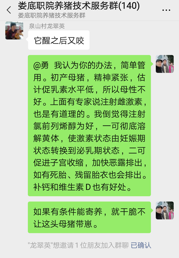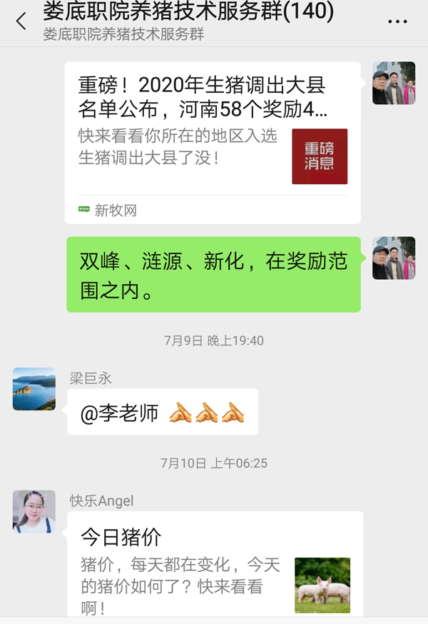 农林工程学院李继仁副教授是一位有着三十余年经验的养殖专家,在今年疫情期间,他创建了“娄底职院养猪技术服务”微信群,目前群中有湘中区域的生猪规模养殖户120余名,娄底职院养殖专家,娄底各县市畜牧干部、官方兽医等20余人。每天,群里热闹非凡,最新的助农政策解读、养殖新技术推广、养殖户经验交流、生猪市场行情等信息不断刷屏。某日,群内一名养殖户反映自家母猪在产仔后,将刚产下的仔猪咬死。群内根据该养殖户发来的视频,纷纷集思广益,马上总结出了有效的方法,帮助该养殖户解决了问题。