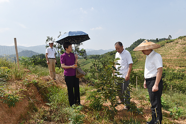 随后,李文莲一行来到村里的农宇种养殖专业合作社,向那里的管理员黄武根等人询问农作物生产情况。这里曾是荒废了很多年的村集体园艺场,在娄底职院科研人员的帮助下,开发了农田130亩,其中80亩栽种红心柚,50亩栽种苹果柿,并套种60亩药百合。去年百合产量12000斤,收益12万元,现在,三至五年生长期的红心柚、苹果柿也在茁壮生长,李文莲走到田间,用手抓取土壤仔细打量水土含量,对于苹果柿叶子上有虫害的问题,她现场打电话给娄底职院种植专家曾玉华,叮嘱他及时赶到这里进行指导。