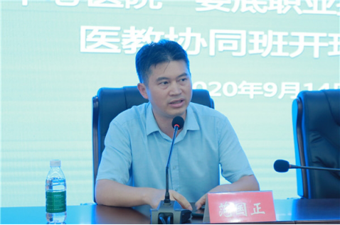 会议由娄底市中心医院护理教研室副主任孙玉红主持,护理学院院长范国正首先做了会议发言,他对市中心医院教学工作表示充分肯定并给予感谢,同时要求同学们要珍惜在医院的学习机会,端正学习态度,改进学习方法,注重培养自主学习的能力,多去科室实践,主动大胆提问,更好地将理论知识与实践相结合,学习医院医护人员的无私奉献精神。随后2019级医教协同班学生代表汤若璇发言,表达了同学们到娄底市中心医院学习的决心与信心以及对医院师资团队的信任。随后,娄底市中心医院党委委员、副院长杜友红在致辞中代表医院全体干部职工对新学员的到来表示热烈欢迎并表达了良好祝愿。杜院长介绍了娄底市中心医院的基本概况及教学工作情况,同时对全体同学及带教老师提出了三点要求:一是所有同学要做到严肃学风学纪,确保学有所得;二是所有同学要做到理论联系实际,确保学有所用;三是所有兼职老师要做到因材施教,确保教学相长。最后,杜院长表态说医院将努力挖掘一切办学资源,恪尽职守、努力工作,为培养新一代优秀护理人才贡献力量。