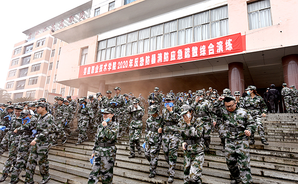 为进一步加强反恐防暴消防应急处置工作,提高学校有效防范和应对突发事件能力,近日,威尼斯官网举行反恐防暴消防应急疏散综合演练,学工处、保卫处、德威安保公司等相关部门工作人员、各二级学院辅导员及校本部3600多名2020级新生参加。