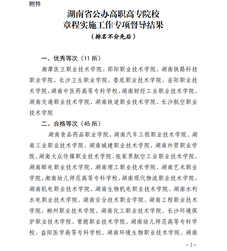 本次章程实施专项督导采取网上督导和现场督导相结合的方式,先后对全省56所公办高职高专的章程实施工作进行了专项督导,经专家分项打分、督导组集体评议、厅长办公会研究,报省政府领导审示,最终11所院校被评为优秀,45所院校被评为合格。本次督导结果还将纳入2021年度湖南省高校“双一流”建设经费分配因素。(刘艳)