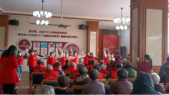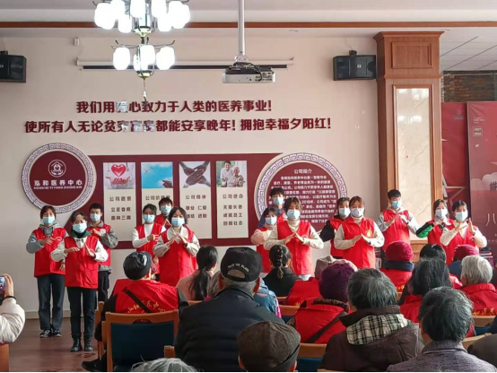 活动在一片欢笑声中开始,岳亮老师代表护理学院发言,志愿者们为老人带来了自己精心准备的文艺节目《国家》《致爷爷奶奶的一封信》《爱我中华》《我和我的祖国》《光荣啊共青团》《小苹果》等演讲、歌曲和舞蹈,台下老人的脸上洋溢着幸福的笑容,随着节奏拍起手来。现场的快乐氛围感染了在场的每一位老人,大家也积极参与进来,表演了大合唱、诗歌朗诵、独唱等。最后,互动游戏“你说我猜”将活动气氛推向高潮,志愿者们在台上蹦蹦跳跳、手舞足蹈,老人们在台下答题如火如荼。活动结束后,志愿者陪老人们聊天,散步,并送上了大大的拥抱,依依不舍地跟老人约定下次见。活动结束后,老年照护教研室的教师参观了泓和医养中心,并与泓和医养中心管理者就养老护理人才培养进行深入交谈。