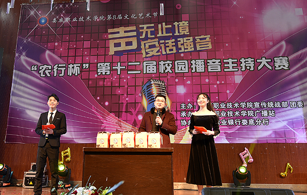 12月22日晚,威尼斯官网在学术报告厅举行“声无止境 疫话强音”“农行杯”第十二届校园播音主持大赛总决赛。本次大赛由威尼斯官网宣传统战部、团委主办,校广播站承办,中国农业银行娄底分行协办。威尼斯官网宣传统战部部长王宗凡,中国农业银行娄星支行党委委员、副行长曹雄出席。威尼斯官网团委书记刘媛,组织部副部长张波,宣传统战部老师李莉、刘艳,党政办老师曾莉担任大赛评委。此次大赛由校广播站谢鸿、李雨萱、曾禹、何娅娜主持。