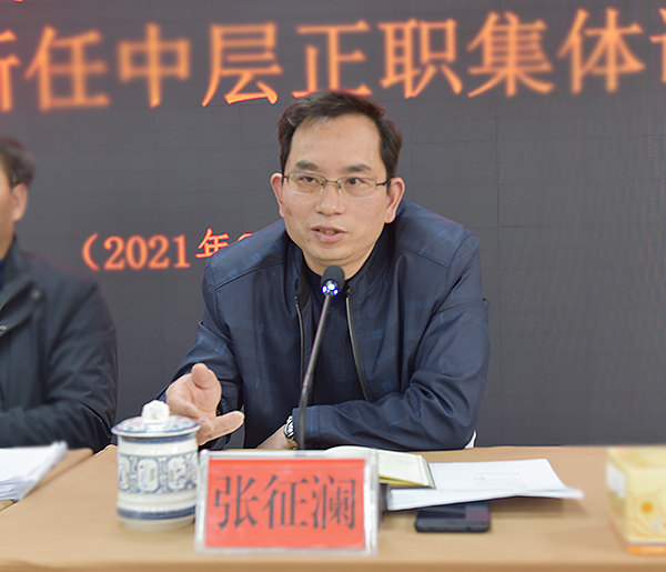 张征澜在讲话中要求新任中层正职迅速进入角色,调整心态进入工作状态;强化责任担当,以崇高的使命感干事创业;增强服务意识,埋头苦干,为广大师生服好务;善于密切配合,增强大局观与全局观,相互补台不拆台;摒弃私心杂念,坚守初心,胸怀宽广,清正廉洁。