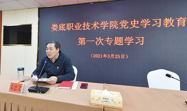 朱忠义强调,要增强“四个意识”,坚定“四个自信”,做到“两个维护”,立足娄职发展,坚持为党育人、为国育才。要准确把握党史学习教育的目标要求和重点内容,高标准高质量推进,学出成效,结出硕果。一是高度重视党史教育学习,将其当成当前最重要的政治任务来抓。二是认真研读党史基本著作,全面了解中国共产党百年奋斗的光辉历程和历史性成就。三是紧跟学校教育教学实际,把党史学习、理论学习,与总结经验、关照现实,推动工作结合起来,把学习的成效转化为工作的动力和实效,更加紧密地团结在以习近平同志为核心的党中央周围,以更加坚定的决心,更加昂扬的姿态开启新征程,奋进新时代,以优异的成绩向建党100周年献礼。