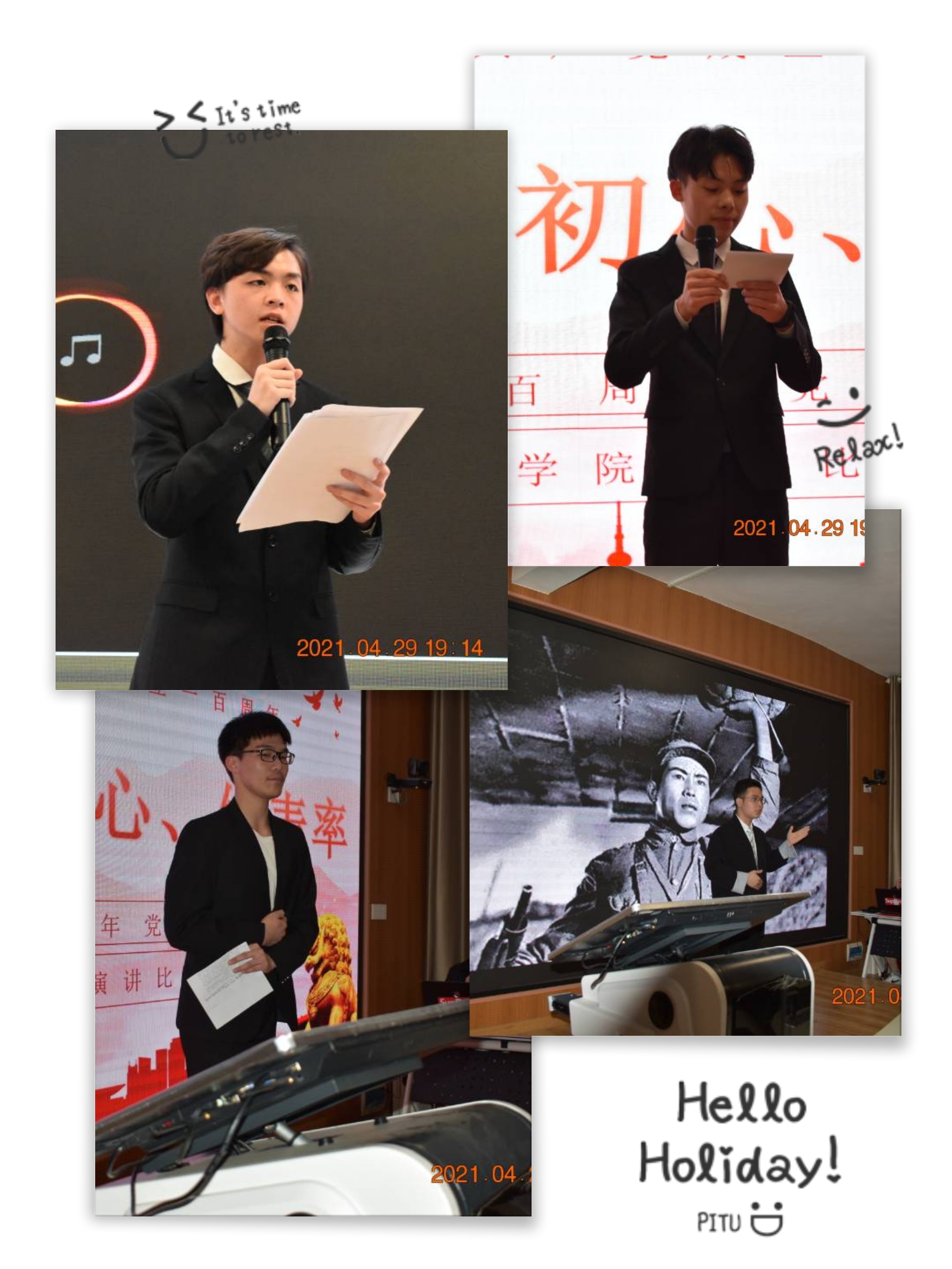 参赛选手围绕演讲主题,情深意切地讲述了建党100周年来的辉煌成就,革命先烈浴血奋战、英勇牺牲的壮烈故事,以及身边党员不忘初心跟党走、立足岗位勇拼搏的感人事迹。他们或结合工作实际有感而发、或通过典型人物事迹抒发感情,时而舒缓动情,时而慷慨激昂,其抑扬顿挫的声线表达,配以音频和PPT等多媒体手段,声情并茂、感情真挚,为每一段演讲赋予了不同的情感色彩,多角度的回顾了我党艰苦创业的奋斗历史,生动刻画了中华民族在中国共产党坚强领导下向民族伟大复兴、国家伟大崛起不断奋进的伟大征程。一段段历史回忆,进行了一次深刻“学党史,强信念,跟党走”的演讲比赛,一个个小故事,展现了我院师生良好的精神风貌。
