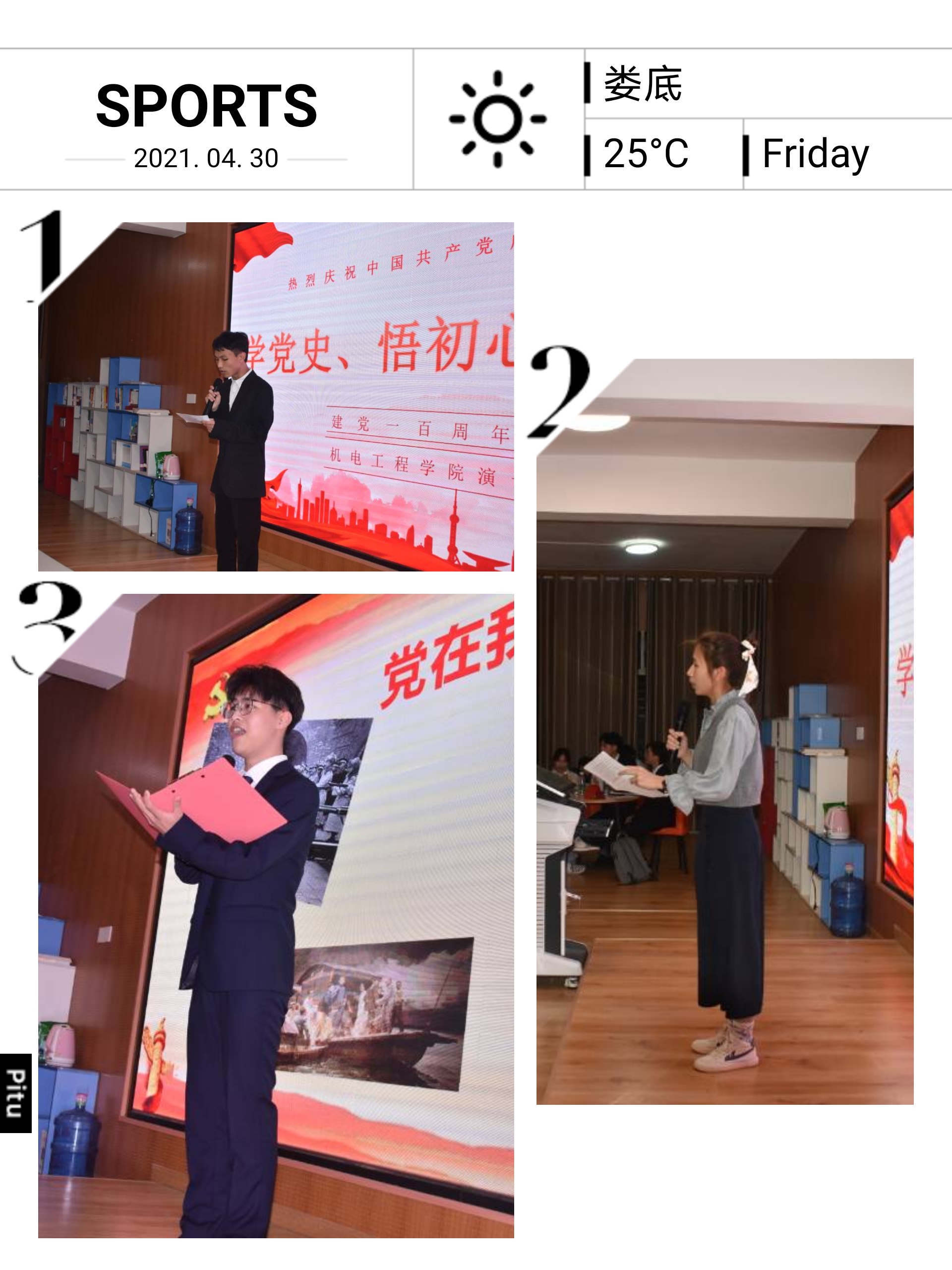 4月29日,机电工程学院举行“学党史,强信念,跟党”演讲比赛。让我院师生进一步了解党的艰苦奋斗历程,感恩党的光辉,永葆政治本色,坚定跟党走的决心。