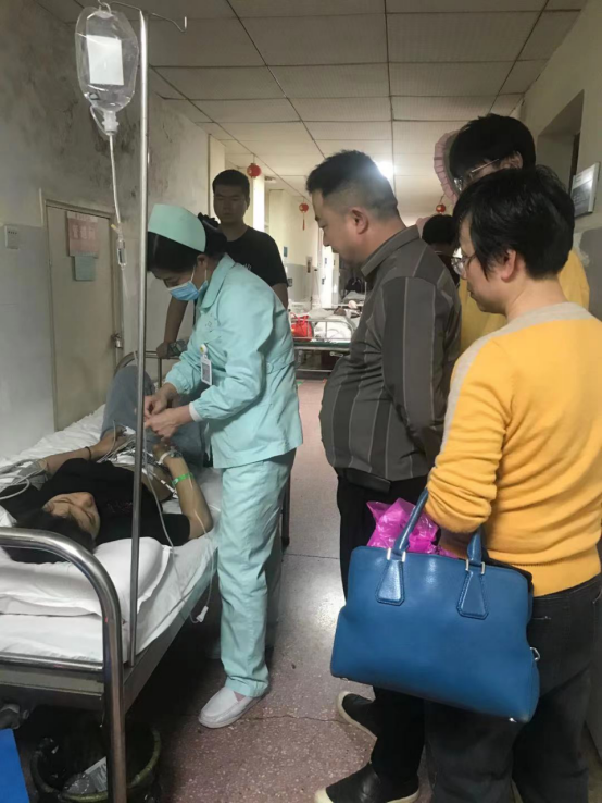 2021年5月7日,电信学院党总支书记李济民、学工副院长邓明亮、辅导员李韶辉老师、学生会主席、团总支书记王滔、学生会副主席、团总支副书记田晓芳等人前往娄底市中心医院看望19级应电班住院学生刘文彬,送上学院的慰问和关怀。