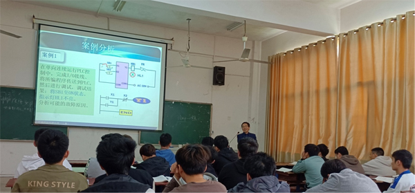 陆老师在机电一体化技术专业讲授《电气控制系统安装与调试》课程。教研室组织听取了陆老师关于“时间继电器控制”章节的讲解。课堂上,陆老师声音洪亮,紧扣教材内容。遇到学生难以理解的知识点,能够耐心细致地为同学们讲解。并拿出实物给大家演示,理论课程完成后,还安排了实验课进行实操巩固。